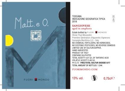 サンジョヴェーゼを6日間マセレーションした後、12ヘクトリットルの砂岩製アンフォラで12ヶ月間熟成させて出荷される、とてもフルーティなワインです。「マッテオ」というワイン名はオリヴィエの息子の名前。ラベルにある手をつなぐ親子の絵は、世代を越えて脈々と伝えられる知識の大切さを表しています。